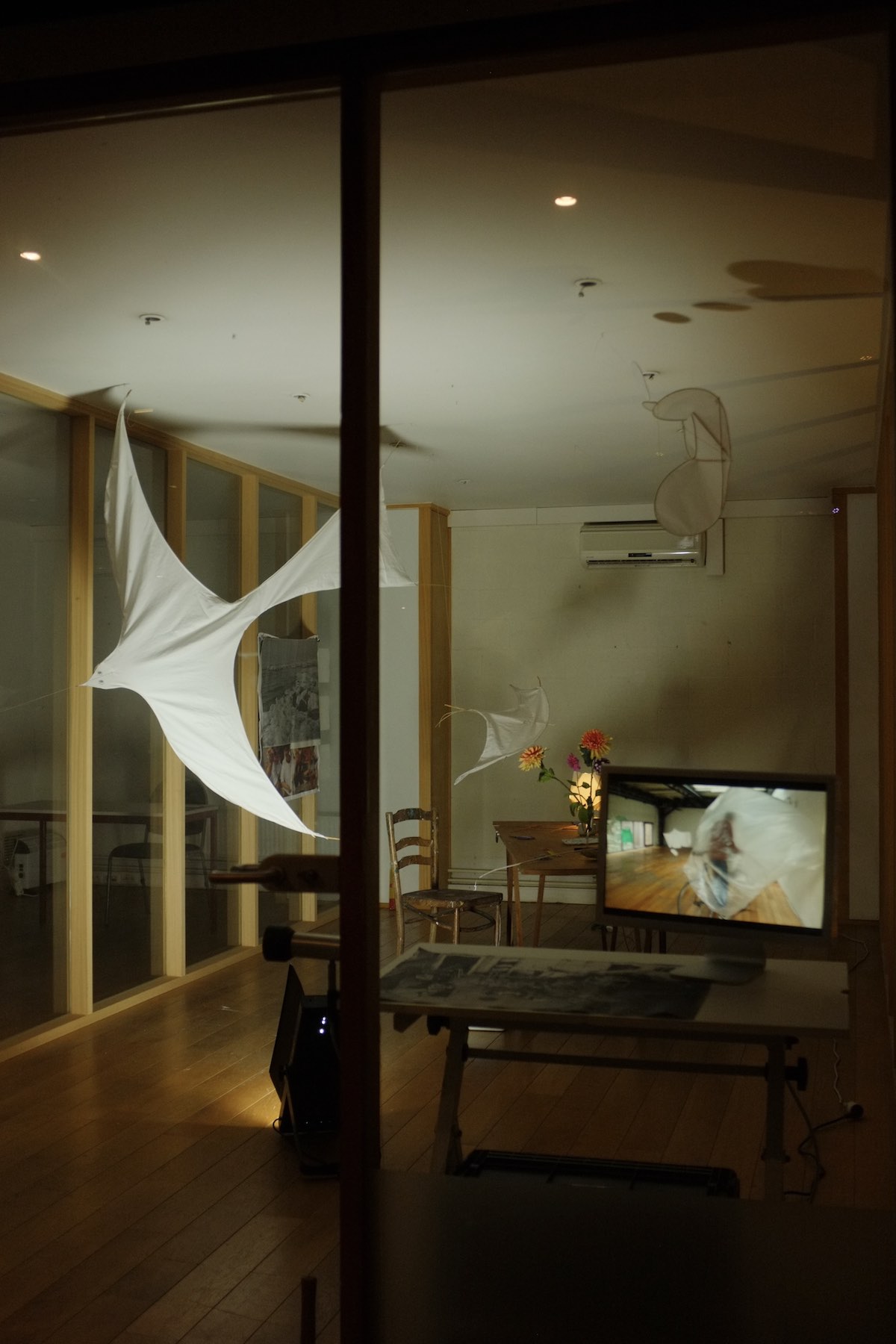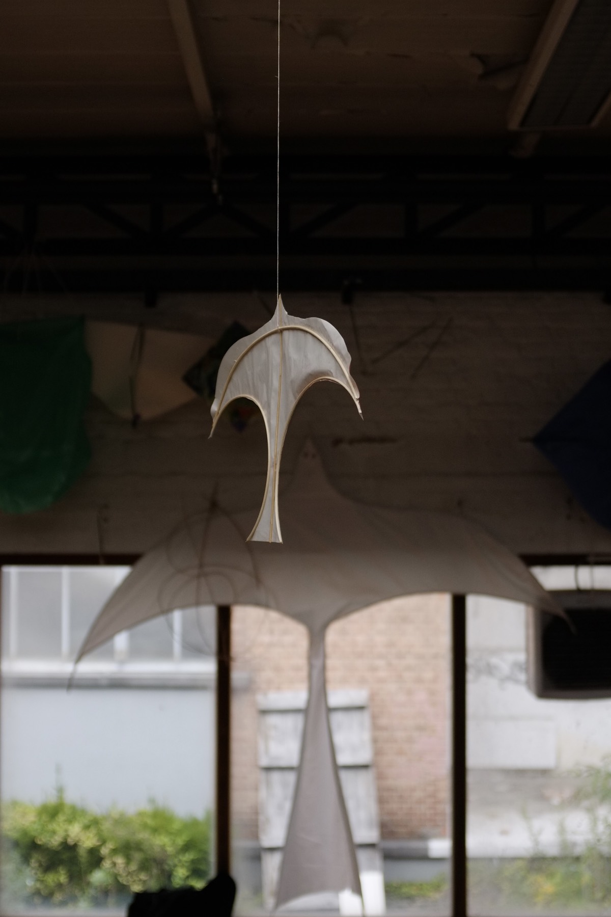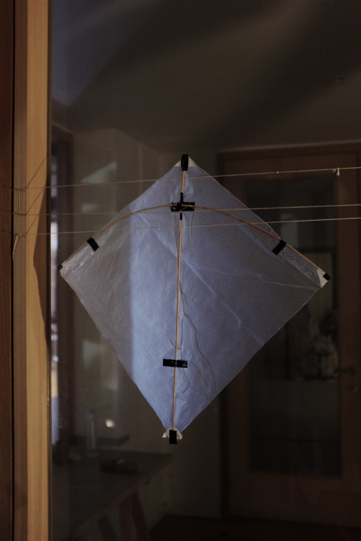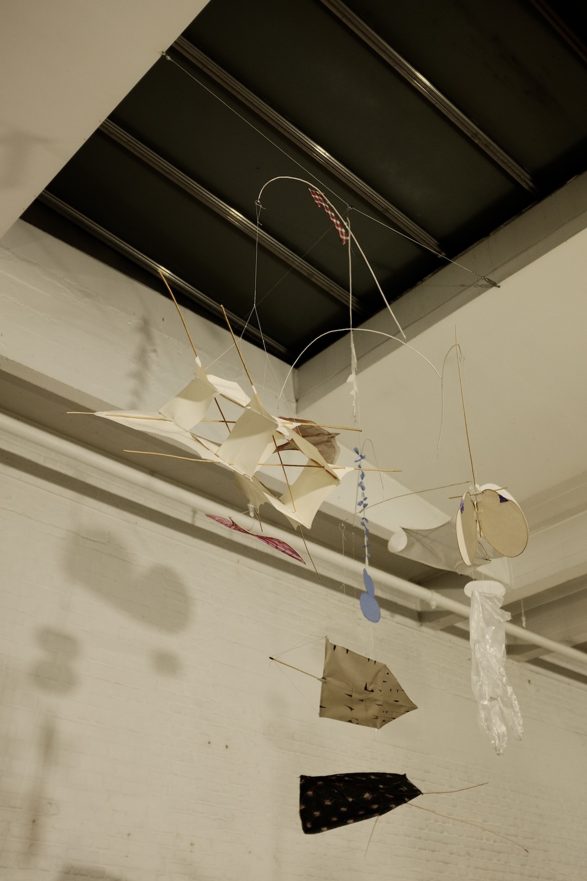 For the last month, Edith has been making kites — collected here as a mobile, a suspended simulation of flight in the fictional sky of the gallery. A mobile is assembled from the bottom up and from the periphery to the centre, its balance found only through negotiation between constructors mediated by gravity. Stranded in this bardo, some of the kites may soon take flight.